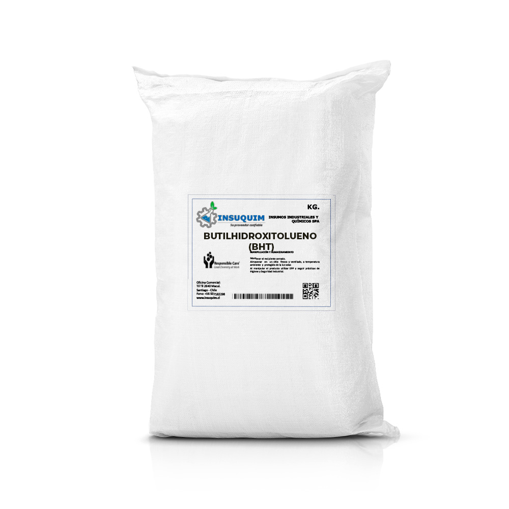 Es un compuesto orgánico lipofílico, químicamente un derivado del fenol útil por sus propiedades antioxidantes. El BHT se usa ampliamente para prevenir la oxidación mediada por radicales libres en fluidos y otros materiales, lo que ha llevado a su uso en pequeñas cantidades como aditivo alimentario. Es un antioxidante sintético utilizado como aditivo alimentario, insoluble en agua y soluble en aceite. Se utiliza para proteger las grasas utilizadas en repostería, cereales, sopas deshidratadas, entre otras aplicaciones. El BHT se utiliza principalmente como un aditivo alimentario antioxidante, esto lo hace útil como ingrediente conservante en alimentos. Con este uso, el BHT mantiene la frescura o evita el deterioro; se puede usar para disminuir la velocidad a la que cambia la textura, el color o el sabor de los alimentos.