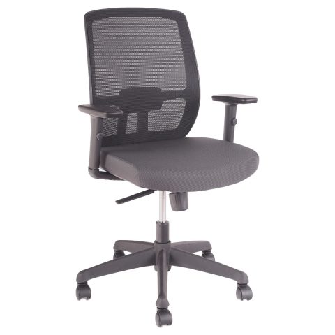 Silla ergonómica con mecanismo sincrónico, deslizador de asiento, fijación en múltiples posiciones y sistema de tensión regulable. Respaldo de malla con soporte lumbar ajustable en altura y ángulo. Apoyabrazos de PU graduables en altura, ángulo y profundidad. Asiento de espuma inyectada tapizada. Gas de 100 mm, base de nylon de 660 mm y ruedas de PU gris de 50 mm. Apoya cabeza de tela, regulable en altura y ángulo, opcional.